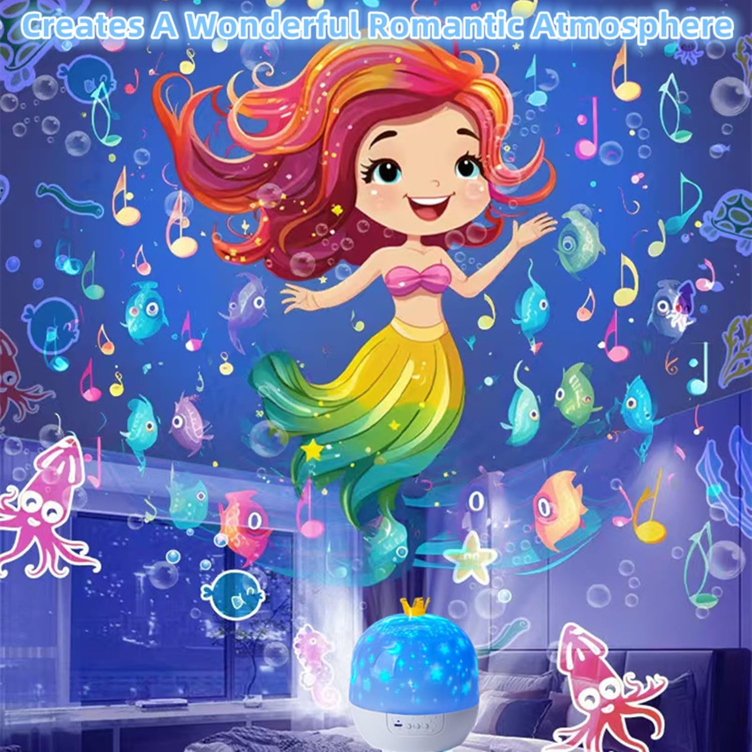 From Whale, Jellyfish & Unicorn to Birthday, Christmas and Aurora — simply drop in a disc and the whole room transforms. Every night tells a new story.